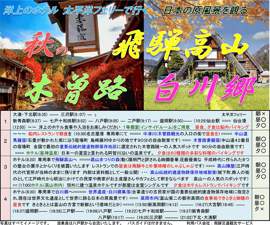 【太平洋フェリーで行く】秋の飛騨高山 木曽路 白川郷仙台港から名古屋港までフェリー、中津川、馬籠宿、高山陣屋ほか