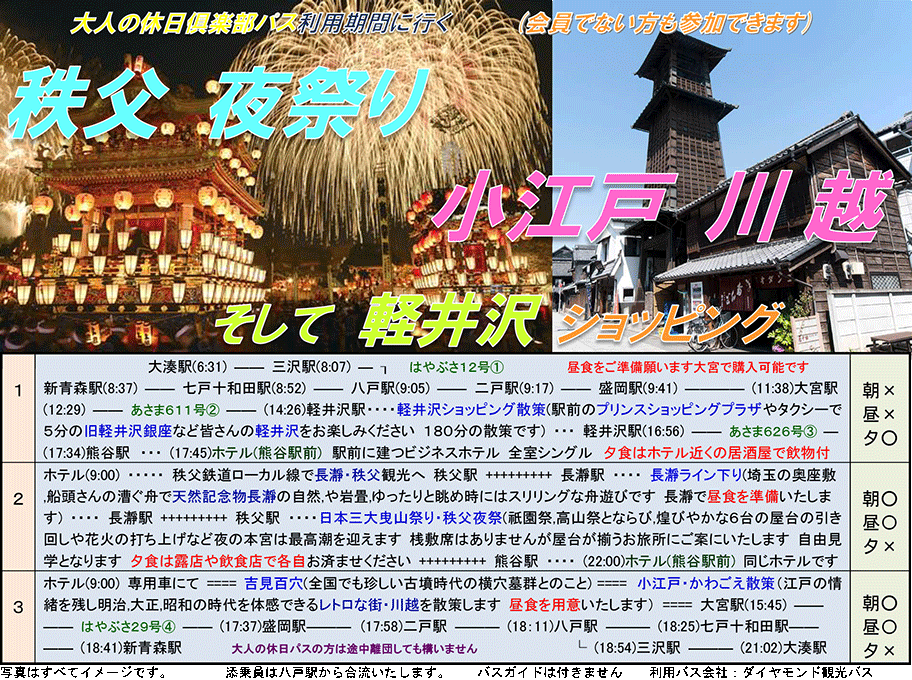 【大人の休日倶楽部利用】秩父 夜祭り、小江戸 川越、そして軽井沢軽井沢ショッピング散策、長瀞ライン下り、古墳時代の横穴 吉見百穴ほか
