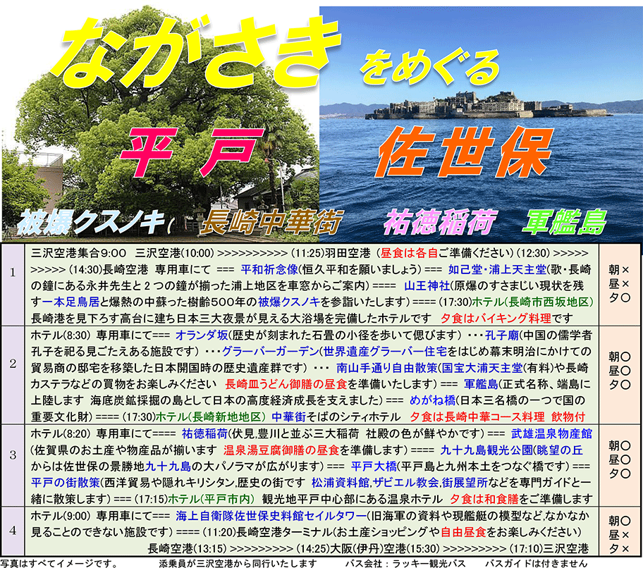 【往路三沢空港=羽田=長崎/復路長崎=伊丹=三沢】長崎をめぐる平戸、佐世保、被爆くすのき、長崎中華街、祐徳稲荷、軍艦島ほか