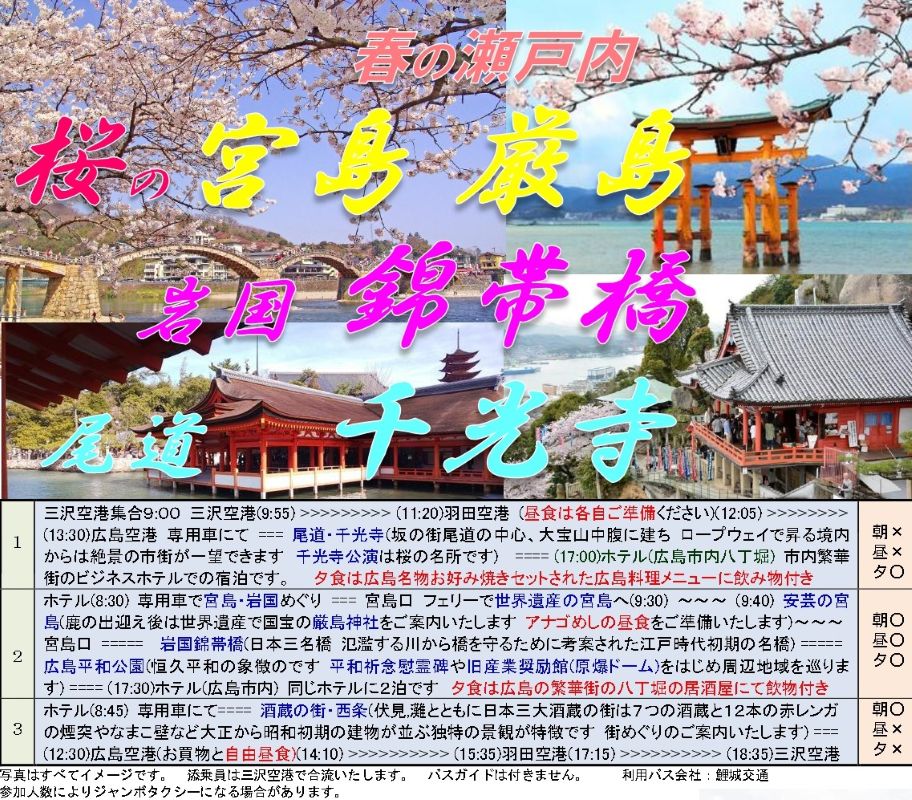 【三沢空港=羽田空港=広島空港】桜の宮島 厳島 尾道尾道千光寺、世界遺産宮島、広島平和公園、広島市内2連泊ほか