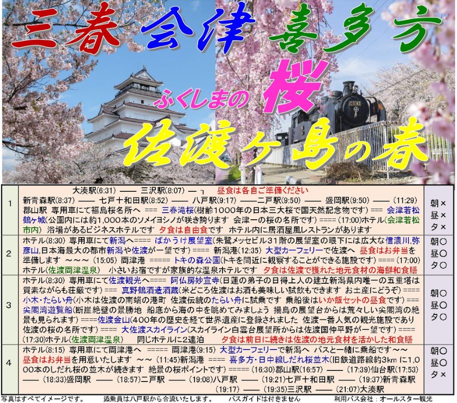【新幹線利用 三春 会津 喜多方 佐渡ヶ島】ふくしまの桜滝桜、鶴ヶ城、ばかうけ展望室、佐渡ヶ島 トキの森公園、小木・たらい舟ほか