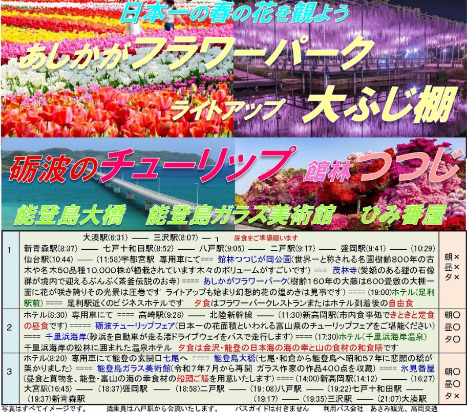 【新幹線利用 春の花を見よう】あしかがフラワーパーク、ライトアップふじ棚、館林つつじが岡公園、砺波チューリップ、千里浜海岸ほか
