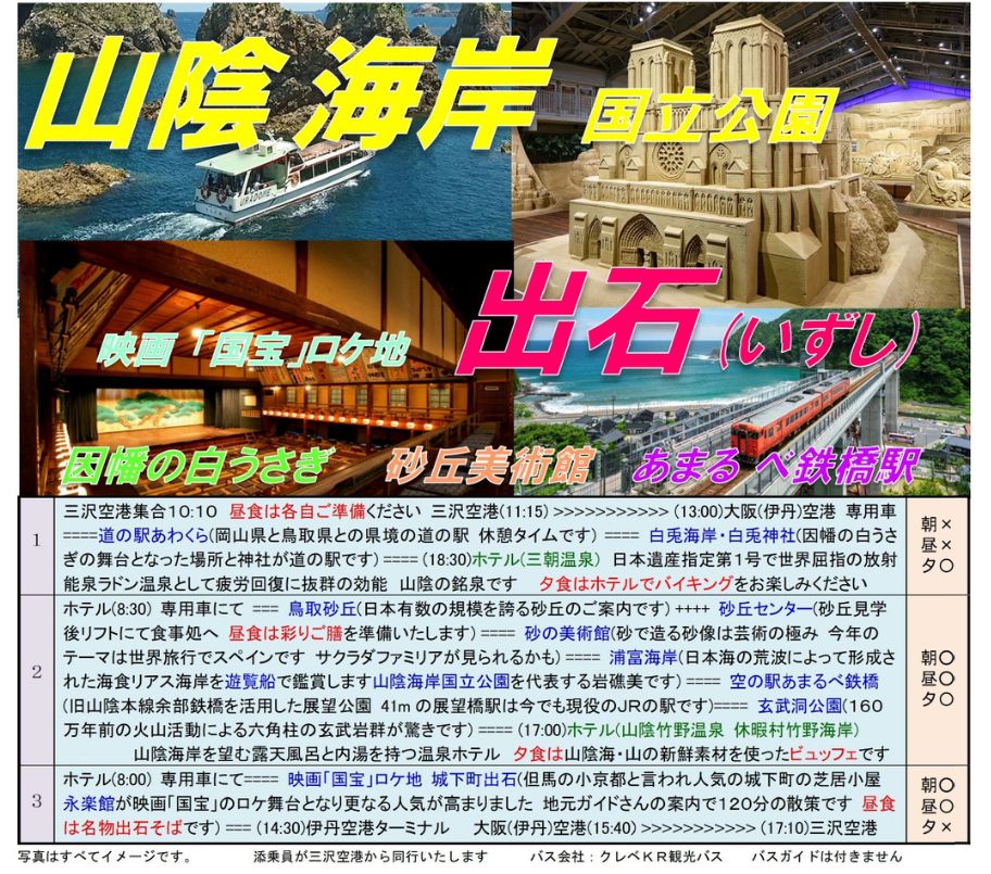 【三沢空港=伊丹空港】山陰海岸国立公園、映画「国宝」ロケ地 出石因幡の白うさぎ、鳥取砂丘、砂丘美術館、あまるべ鉄橋ほか